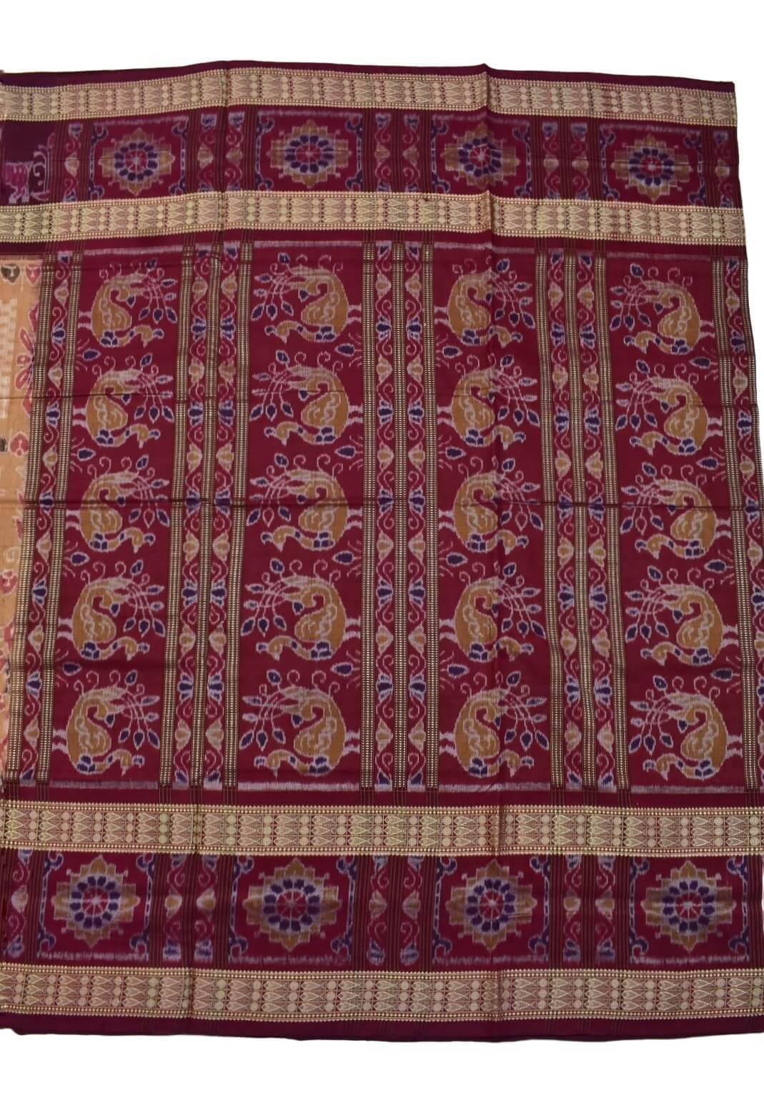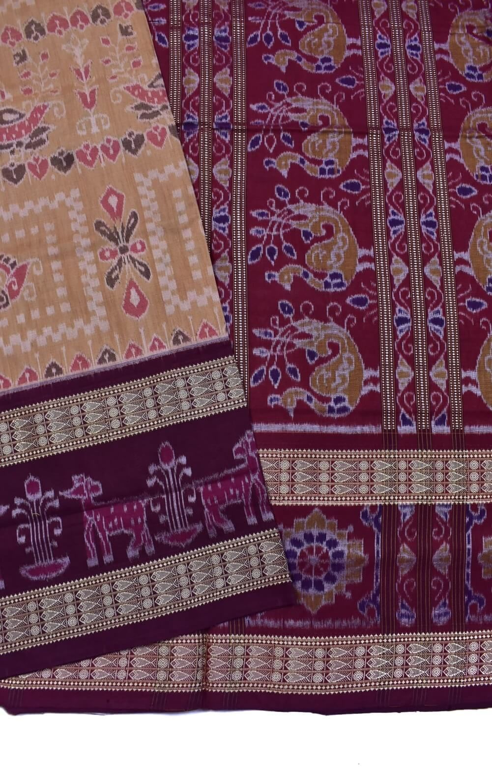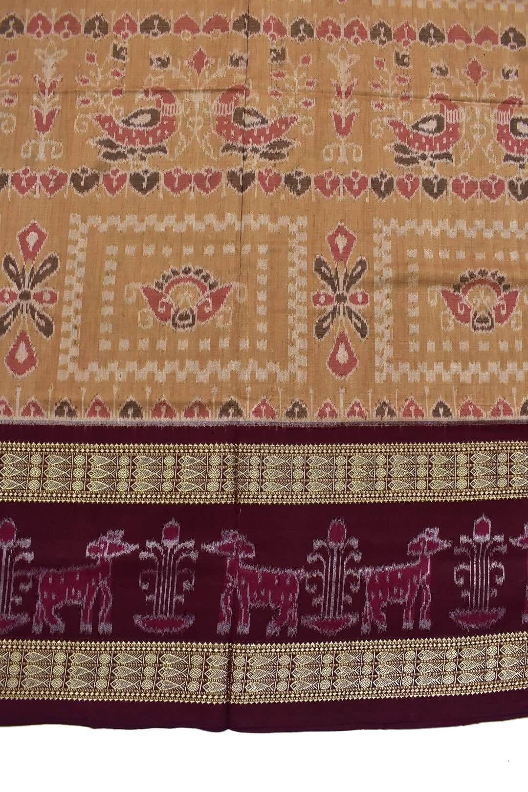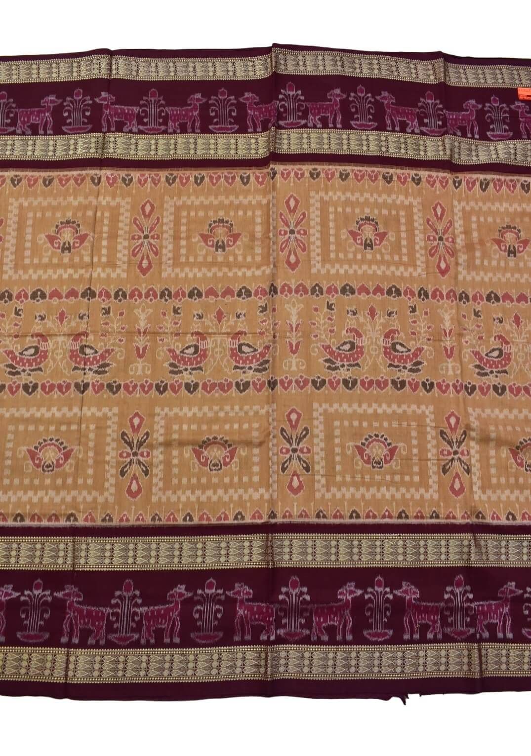 Biscuit Colour Double Border Sambalpuri Handloom Bandha Cotton Saree