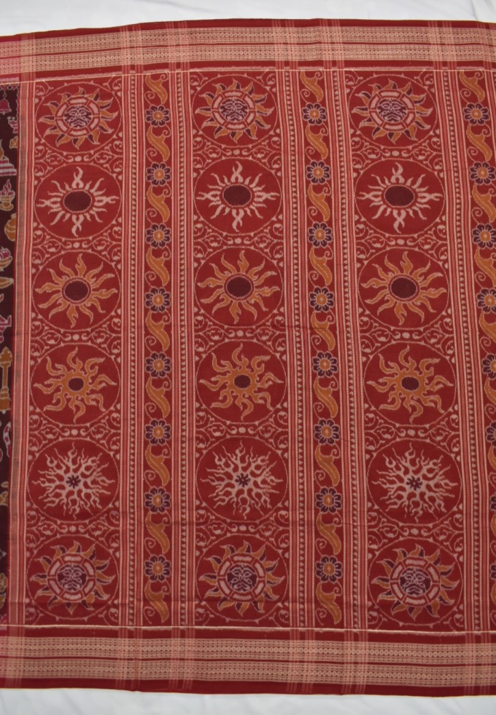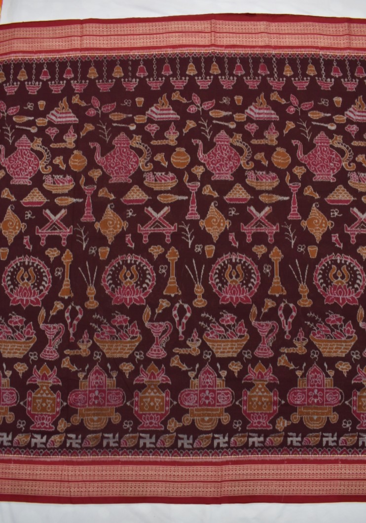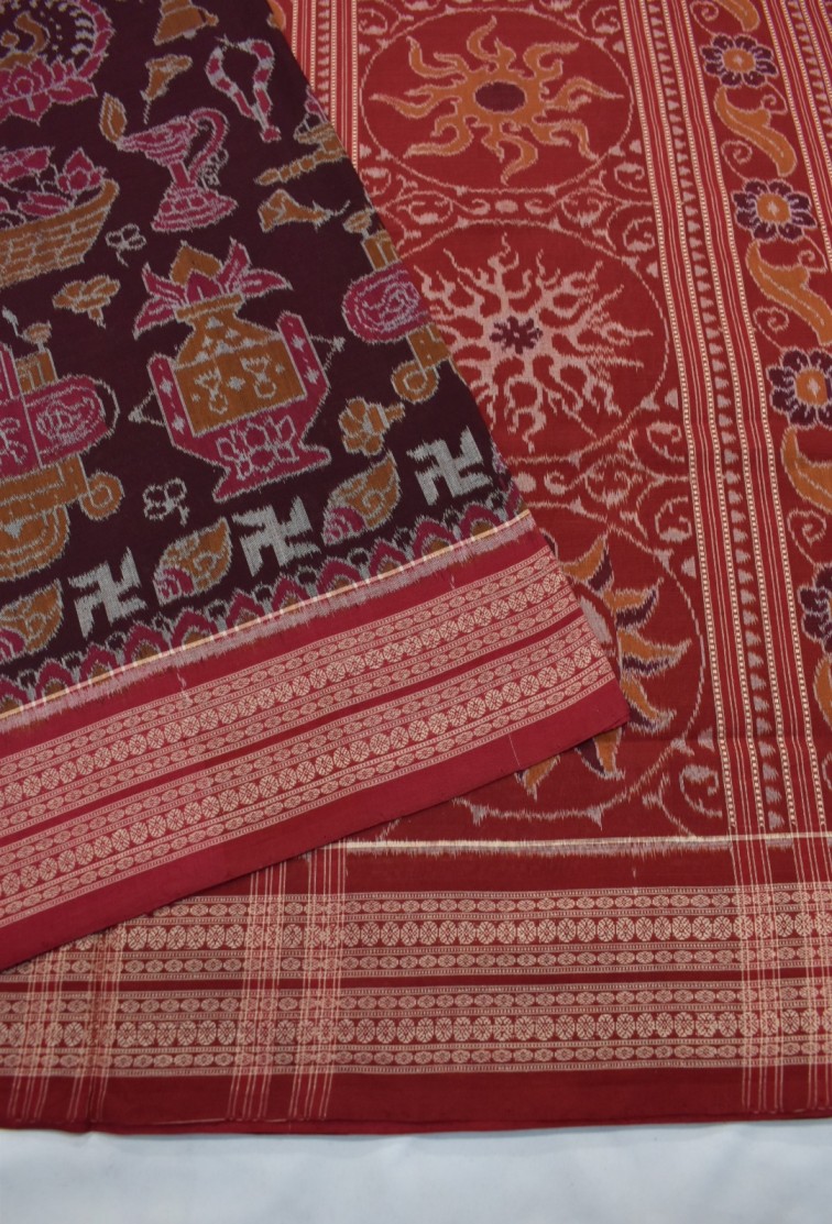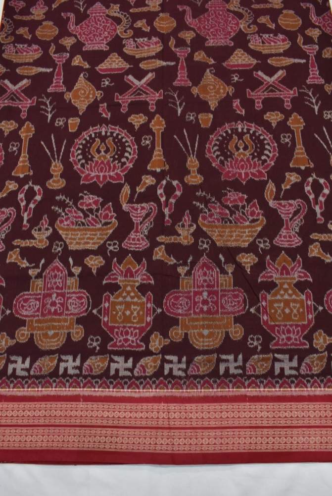 Maroon Colour Worship Material Design Sambalpuri Handloom Cotton Saree